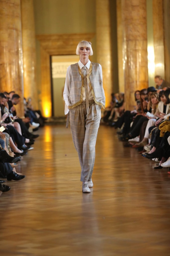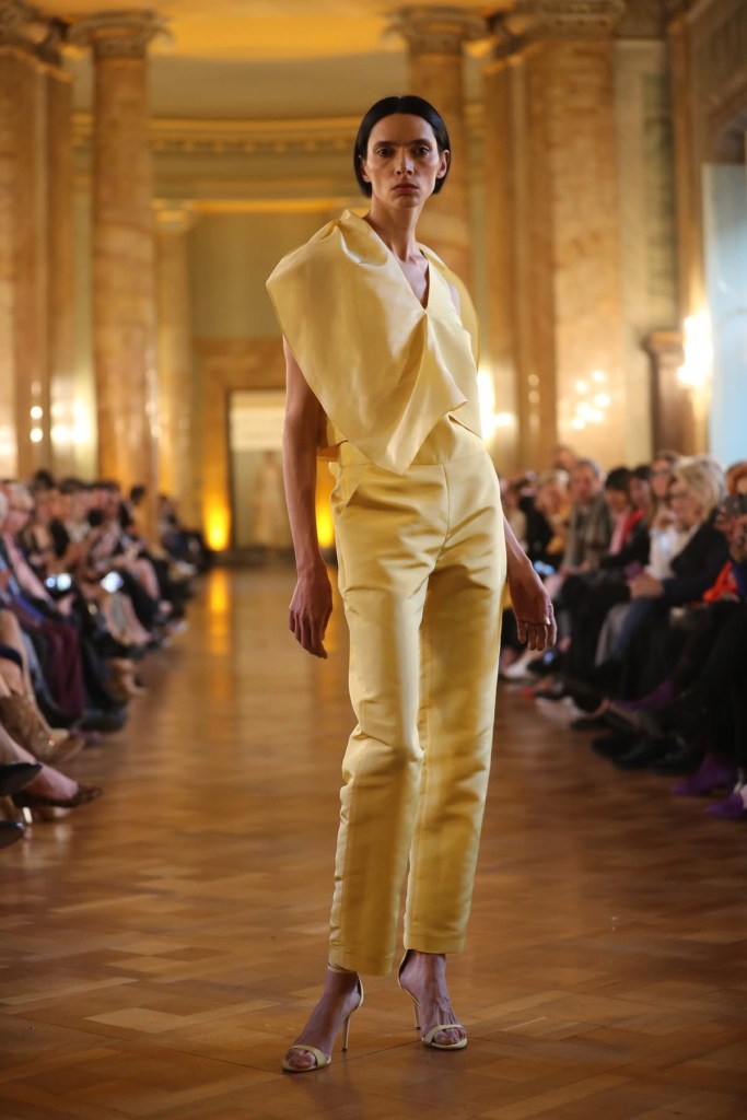 Fino ad arrivare alla pre-sera nei toni del bianco, dell’ocra e dei gialli con la tuta doppia con il fondo chiuso a coulisse che evoca un pigiama da sere d’estate e al top decorato con una vistosa rouche che sembra osservata con una lente di ingrandimento e strutturato a gabbia sul retro.