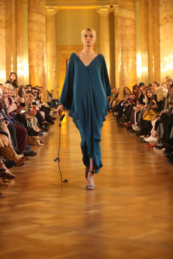 Per la sera capi sontuosi che sembrano sottratti alla ritrattistica dell’epoca come l’abito color ottanio con maxi volant che abbracciano il corpo e l’abito blu notte con corpino decorato di cristalli quasi fosse un cielo stellato abbinato a lunghe collane.