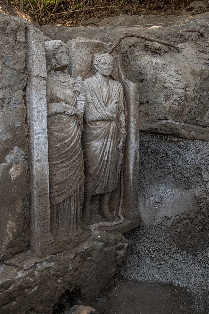 Un rilievo funebre di una coppia, uomo e donna – a dimensioni quasi reali – pertinente a una tomba monumentale presso la necropoli di Porta Sarno, è affiorato nel corso di uno scavo archeologico, nell’ambito del progetto di ricerca “Investigating the Archaeology of Death in Pompeii” condotto dall’Universitat de València in collaborazione con il Parco archeologico (direzione scientifica del prof. Llorenç Alapont).