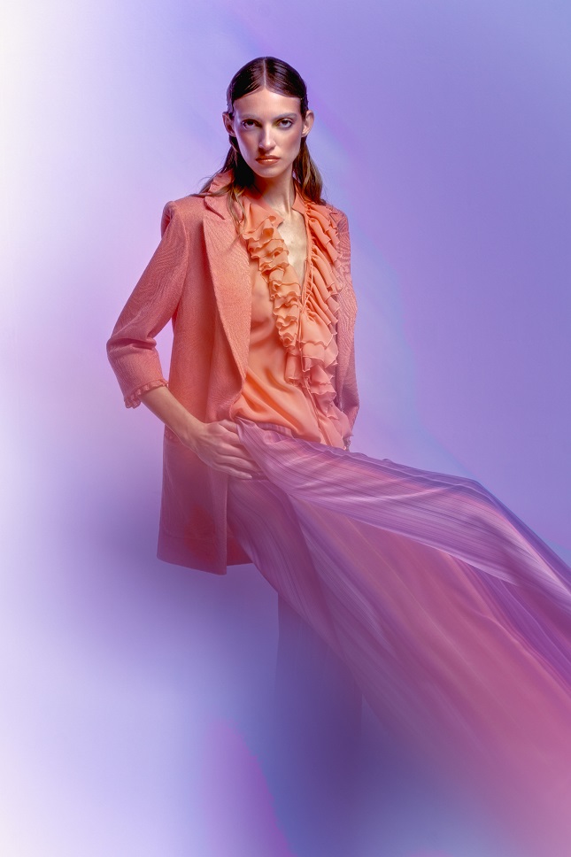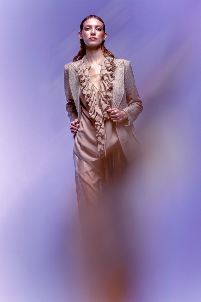 Nuovi Jacquard pregiati e leggiadri si sposano a volants e rouches delicate in seta elastica che animano i capi con dettagli inattesi e di carattere.