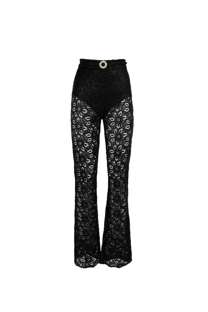 L’attenzione ai dettagli emerge nei gemelli gioiello, nella camicia con inserti in macramè e nella fibbia artigianale dei pantaloni.