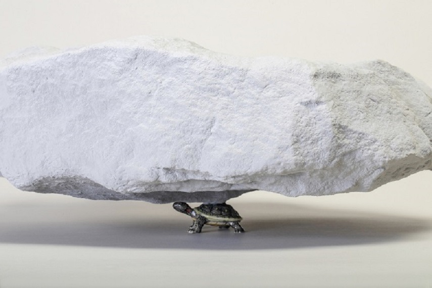 L’artista attinge al repertorio del ready made, trasformando statuine kitsch, oggetti di recupero e icone dell’arte in nuove narrazioni: una tartaruga che trascina un masso, un elefante intento a giocolare con sfere colorate, un gruppo di dame che danzano con il volto celato da vasi.