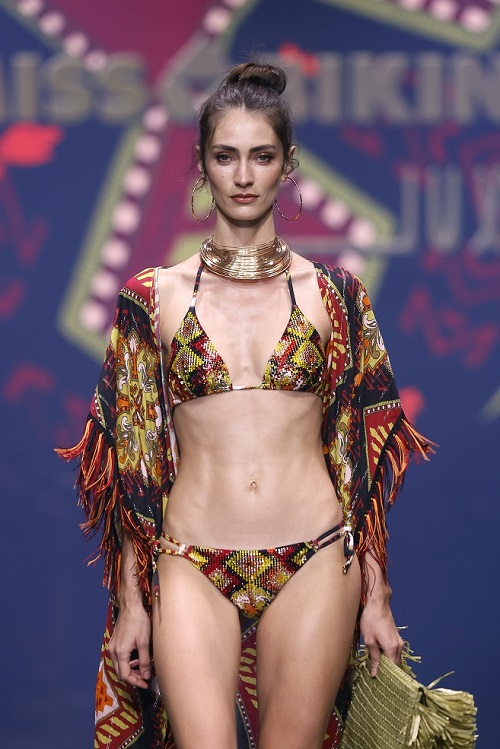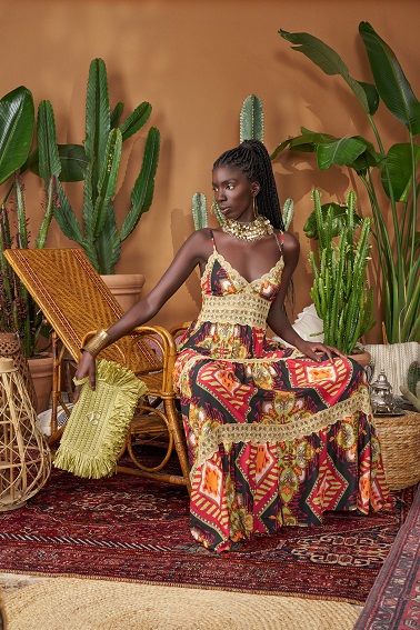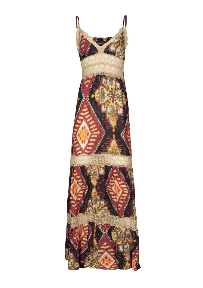 Non solo beachwear nell’estate di Miss Bikini Luxe, che accoglie quelle stesse suggestioni dall’anima *gipsy chic*, racchiudendole nei maxi-dress con balze e inserti di sangallo e pizzi a contrasto con i motivi tribali delle stampe, manifesto di una femminilità libera e vivace. Allo stesso modo, il crop top lilla, percorso da micro-nappine multicolor e abbinato a un maxi gonnellone a balze, invita alla danza e alla gioia di vivere l’estate senza indugio.