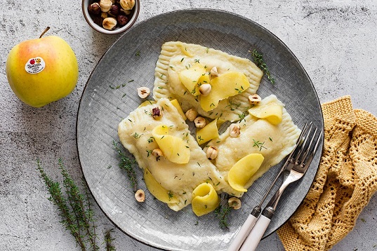 Il soffice impasto a base di patate avvolge un connubio di sapori equilibrati e sorprendenti: la dolcezza delle mele Golden Delicious Val Venosta si sposa alla perfezione con la cremosità del formaggio, creando un ripieno irresistibile.