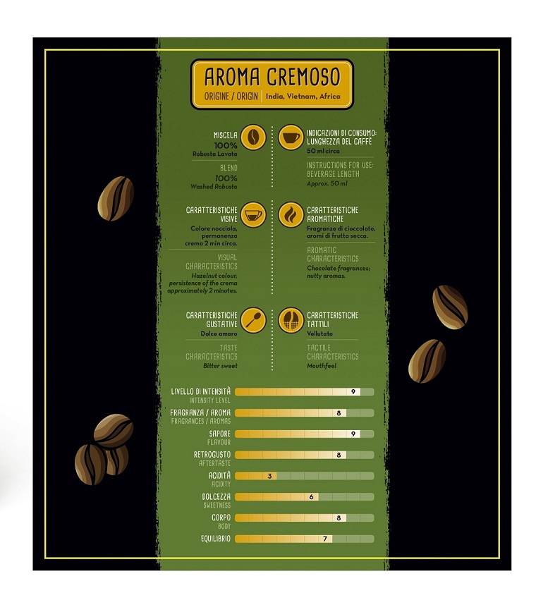 Il consumatore finale potrà trovare, direttamente sulla confezione e in bella evidenza, una serie di dati e informazioni riguardanti la botanica e origine del caffè, la tipologia di miscela, le caratteristiche visive e quelle gustative, essenziali al momento dell’acquisto.