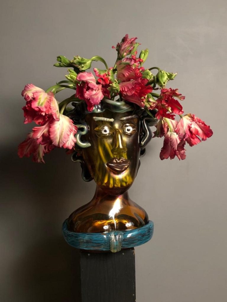 Le sue teste in vetro soffiato si ispirano alle maschere dei faraoni egizi e alle oinochoe greche, a volte bifronti, così come alle fiasche da vino dell’Impero Romano. Allo stesso tempo, sono anche vasi che richiamano le nature morte barocche del XVII secolo, simboli di vanitas e caducità, pur rappresentandone l’opposto: sono nature vive, da mantenere vitali secondo il proprio desiderio.
