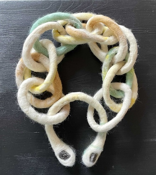 Il lavoro tessile con il feltro è molto importante per Pizzo Scuto, si tratta in questo caso di un non-tessuto, il materiale più antico della storia dell’umanità, e quando nell’antichità gli uomini abbandonarono le pelli animali, lo fecero perché impararono a lavorare la lana in feltro. E proprio sulla base di questo tessuto grezzo l’artista, non solo recupera simbolicamente una pratica millenaria, ma lavora e produce ricami e composizioni che nel processo di trasformazione diventano veri e propri simboli che legano memoria, presente e tradizione… La sua arte, permeata da un’intensa connessione tra i sensi e l’uso dei materiali, invita lo spettatore a una riflessione profonda sulla percezione, sull’esperienza sensoriale e sul legame fra passato e presente. L’artista non si limita a creare opere, ma agisce costruendo trame, matrici di segni ondulatori e ripetuti in cui il tempo e lo spazio sembrano fondersi in un’unica, potente, esperienza estetica».