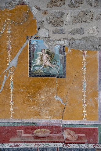 Nell’affresco è raffigurato il tragico momento della morte della fanciulla mentre tende la mano al fratello in cerca di aiuto. La raffigurazione del racconto mitologico è un esempio di un immaginario diffuso di tragedie di uomini e donne, ragazze e ragazzi, vittime di cataclismi vari, anche se non si può trascurare che nel I sec. d.C. queste storie non hanno più la valenza religiosa e culturale, che invece avevano avuto nell’età arcaica e classica. Dobbiamo supporre, dunque, che la loro funzione nelle case dei ceti medio e alto era principalmente l’intrattenimento, l’esibizione dello status economico e culturale, la “bellezza”, che traspare anche in questa domus di medie dimensioni.