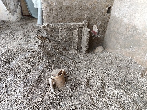 Proprio questa apertura potrebbe aver determinato l’ingresso dei lapilli che cascavano a pioggia all’interno della casa durante le prime fasi dell’eruzione, e da cui le vittime, oggi rinvenute, avevano provato a proteggersi rifugiandosi in un ambiente, sbarrato con un letto. Di quest’ultimo è stato possibile riprodurre il calco, dopo aver individuato nella cenere solidificatasi dei vuoti, formatisi a seguito della decomposizione organica del legno. All’interno dei vuoti è stato versato il gesso per ricostruire la forma del letto conservato come impronta nella cenere.