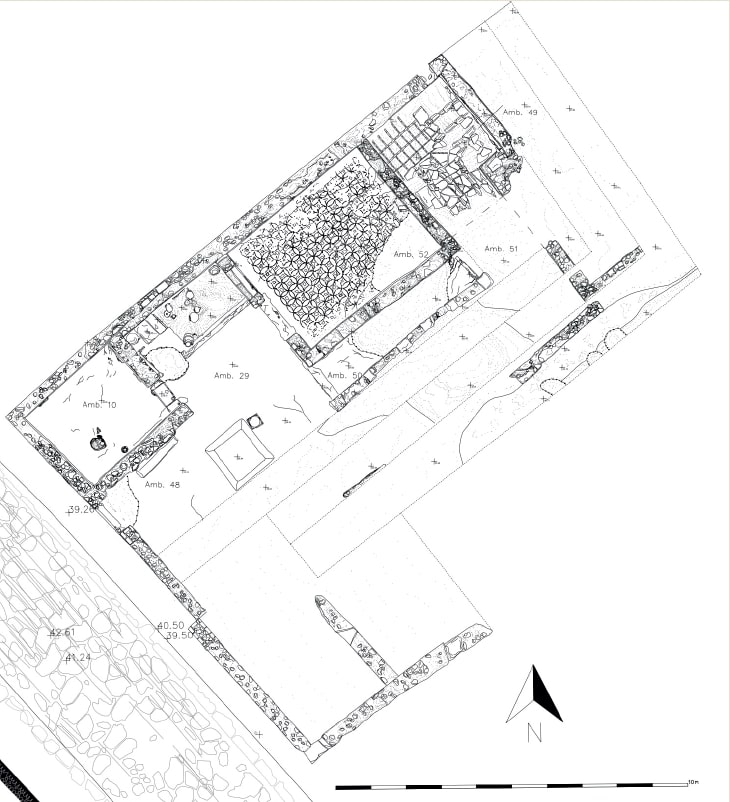I principali ambienti portati in luce oltre all’ingresso, sono l’atrio con impluvium (vasca di raccolta delle acque), una camera da letto (cubiculum), una sala da banchetto (triclinium) con pareti riccamente decorate, e un vano con una tettoia e un’apertura al centro per il passaggio dell’acqua piovana.