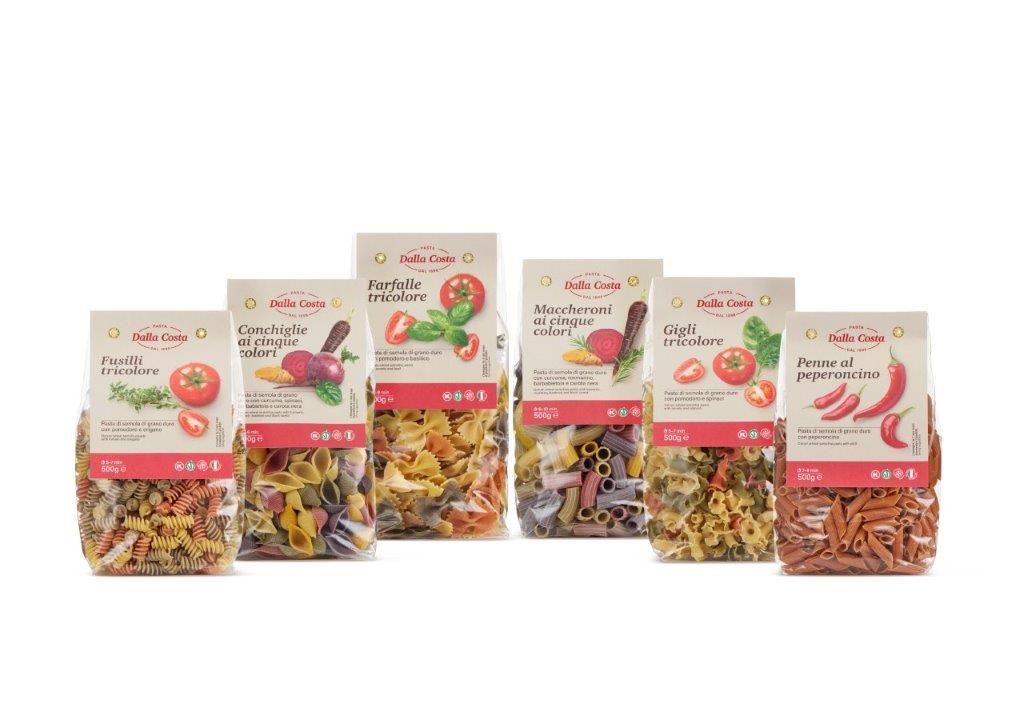 Tra le protagoniste di Pasta Dalla Costa ci sarà la Linea tricolore aromatizzata, che rende omaggio all’italianità, privilegiando una selezione accurata delle semole, dei vegetali e di un processo produttivo che segue la tradizione, fatta di trafilatura ruvida e grano 100% italiano. In primo piano le Conchiglie 5 colori con curcuma, spinaci, barbabietola e carota nera.
