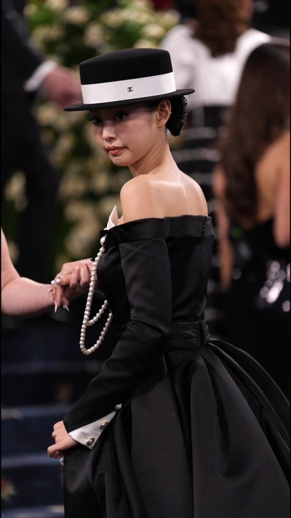 Jennie torna sul tappeto blu per il terzo anno consecutivo, indossando l’eleganza senza tempo di Chanel interpretato come un tributo alla fondatrice della casa di moda. Ambasciatrice della maison francese dal 2017, ha indossato una tuta nera in satin con spalle scoperte, impreziosita da cabochon di perle, una camelia bianca in seta, uno dei simboli della maison, e bottoni gioiello. Il tutto era completato da una drammatica sopragonna in satin nero foderata di taffetà bianca, un cappello bicolore e décolleté Chanel coordinate. Trucco leggero e un elegante chignon basso.
