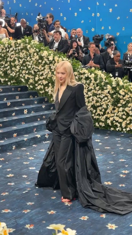 Rosé in Saint Laurent, ha fatto il suo ritorno al Met Gala con un ensemble sofisticato composto da un completo nero su misura e un mantello, ispirato all’estetica del dandyismo e alle recenti collezioni di Anthony Vaccarello. L’outfit includeva sandali rossi con tacco e una lunga collana Tiffany. A contribuire al look, un trucco studiato con eyeliner alato, blush delicato e gloss rosa pallido. I capelli, con effetto bagnato stile “mermaid” completavano il look.