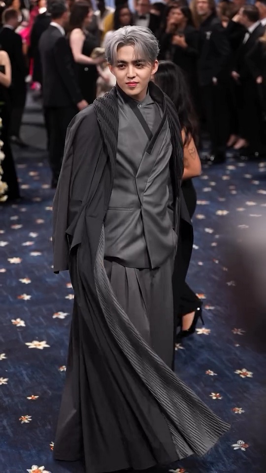Debutto sul red carpet del Met Gala anche per S.Coups. Nuovo volto globale di Hugo Boss, il leader dei SEVENTEEN ha reinterpretato la tradizione con un completo grigio tono su tono, con richiamo all’hanbok. Un abito rilassato composto da più strati e un imponente cappotto da sera. Come accessori ha optato per un look semplice con orologio.