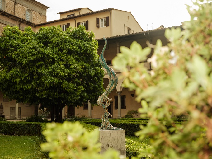 Questo spazio, con il suo verde rigoglioso e l’albero di arancio che si erge al centro, diventa un palcoscenico naturale perfetto per le sculture di Roggi. Nel suo immaginario poetico troviamo spesso l’elemento albero, simbolo di vita e di connessione: che sia l’ulivo o, a volte, il cipresso, presenze distintive del paesaggio toscano, si ricollegano all’iconografia della grande tradizione pittorica antica e moderna, da Beato Angelico a Leonardo, da Paolo Uccello a Ottone Rosai e Ardengo Soffici.