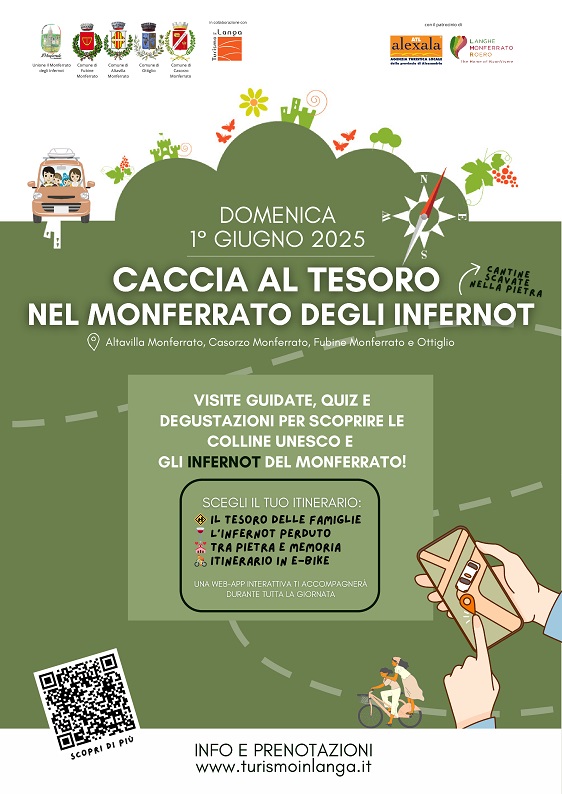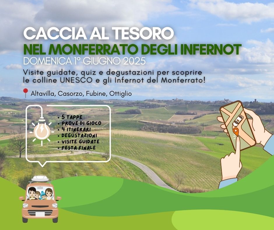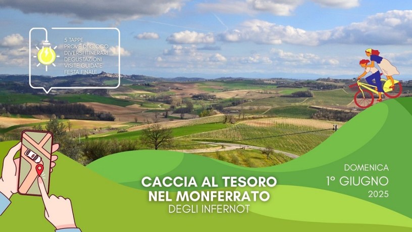 Domenica 1° giugno 2025, i Comuni dell’Unione del Monferrato degli Infernot propongono la seconda edizione della Caccia al Tesoro nel Monferrato degli Infernot, in collaborazione con l’Associazione Turismo in Langa, che da anni è promotrice del medesimo format di gioco sul territorio collinare delle Langhe, con il patrocinio dell’Ente Turismo Langhe Monferrato Roero.