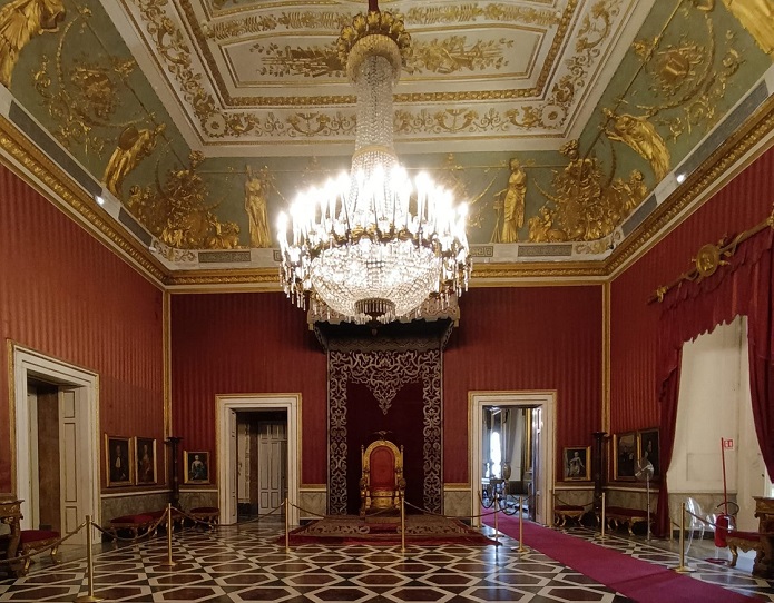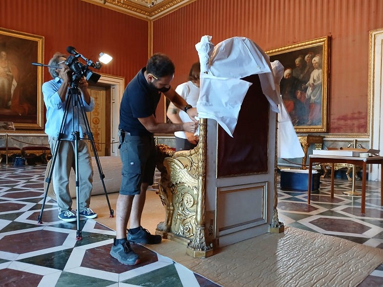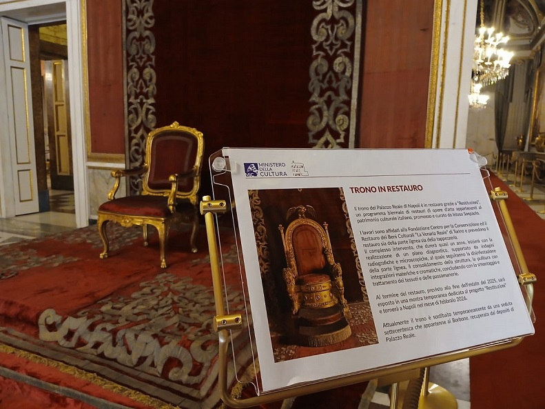 Il 12 settembre dello scorso anno il trono di Palazzo Reale è partito alla volta del Centro Conservazione e Restauro La Venaria Reale di Torinoper il restauro reso possibile grazie al progetto “Restituzioni” di Intesa Sanpaolo ed al momento è stato sostituito da una seduta borbonica settecentesca.