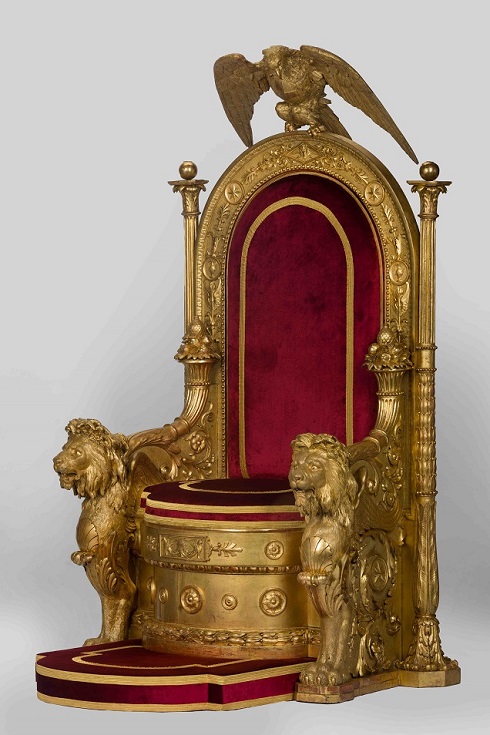 Il trono, con sedile a tamburo, presenta elementi di stile Impero che rimandano all’artigianato della Restaurazione, come i braccioli decorati da leoni alati di grande effetto scultoreo. La spalliera di forma ottagonale è ornata da borchie e rosette classicheggianti che compaiono, ad esempio, nel trono di Napoleone I, disegnato da Charles Percier e Pierre-François Fontaine (oggi al Louvre).