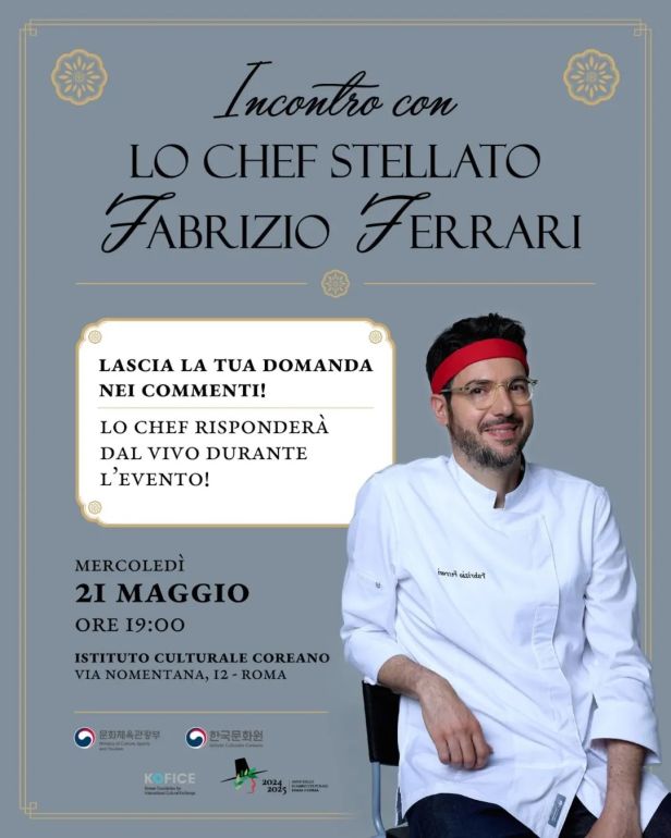 Un appuntamento imperdibile per tutti gli appassionati di cultura e gastronomia coreana: martedì 21 maggio alle ore 19:00, l’Istituto Culturale Coreano di Roma ospiterà lo chef stellato Fabrizio Ferrari – conosciuto anche come “Fabri” – per un esclusivo Talk Show sul ruolo dei media nella diffusione dell’Hansik. La cucina tradizionale coreana.