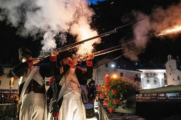 21.00 Borgo e piazza di Bard: rievocazione del tentativo notturno di attraversamento del borgo: scaramucce, cannoneggiamenti, spettacolo di luci e racconto immersivo