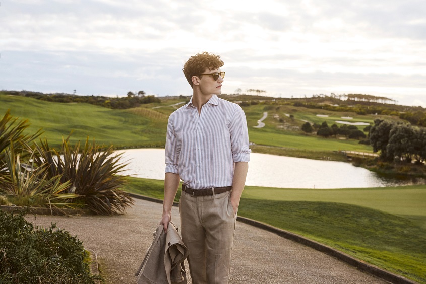 Protagonista della narrazione è un’eleganza disinvolta, che si esprime attraverso capi iconici della stagione: linee essenziali, tessuti leggeri e una palette ispirata alla natura – con toni neutri, verdi morbidi, sabbia e azzurri delicati – definiscono il guardaroba del gentleman moderno.
