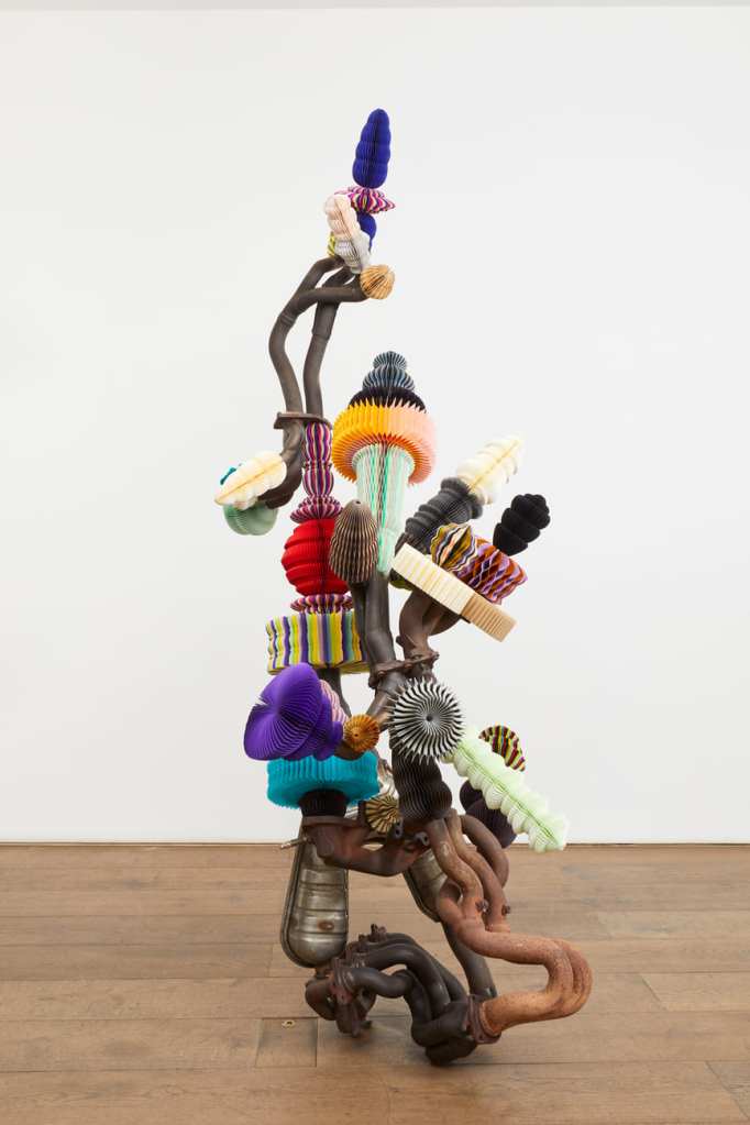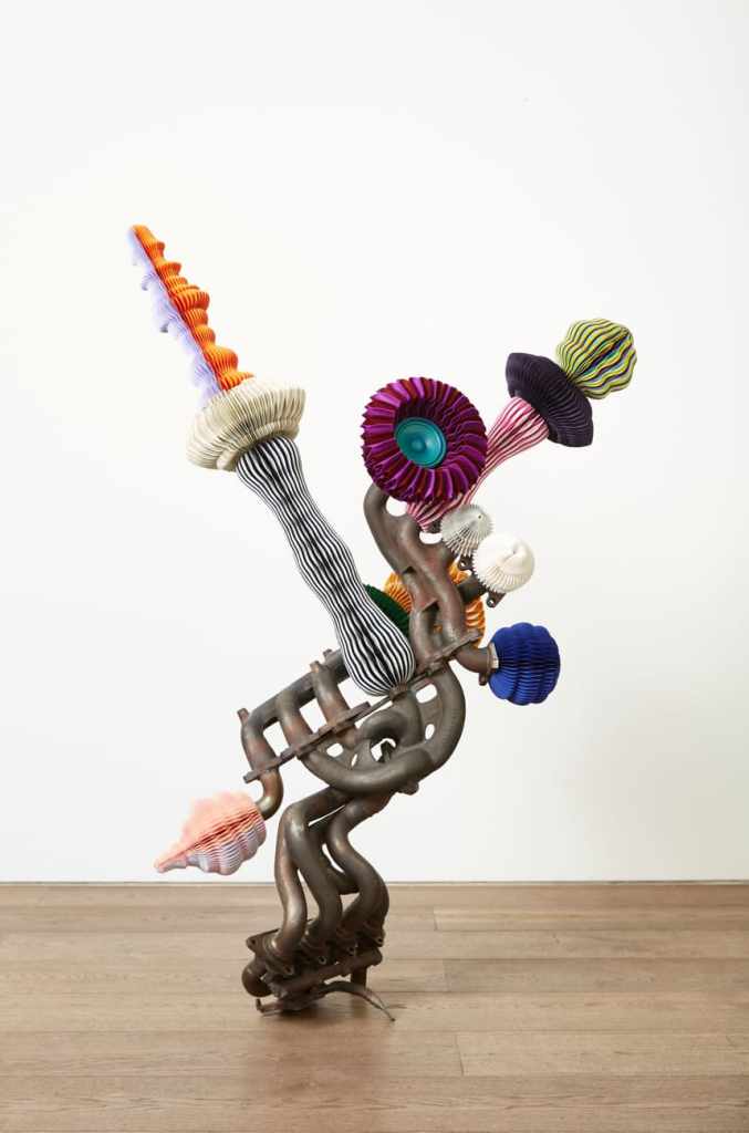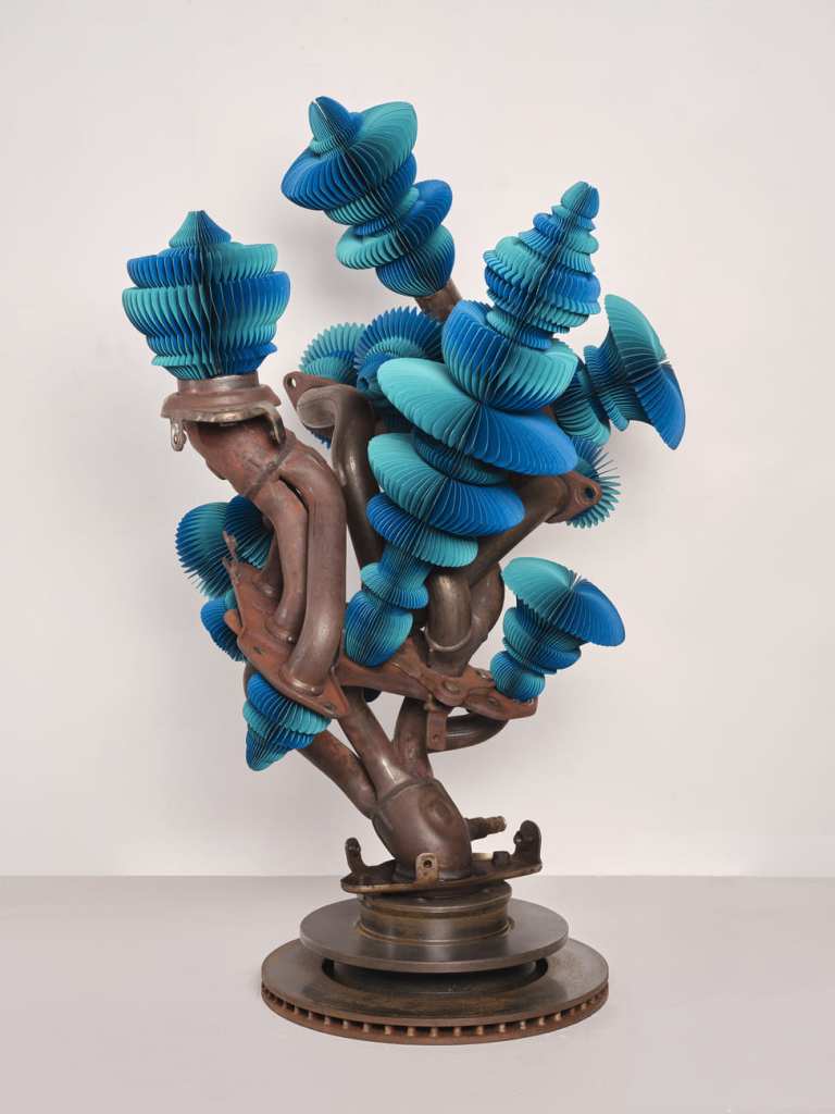 L’artista fonde materiali industriali – componenti meccaniche, motori dismessi, metalli – con elementi delicati e artigianali come carta piegata a mano, feltro cucito, tessuti: una combinazione che richiama il concetto di wabi-sabi, ovvero la bellezza dell’imperfezione e della transitorietà. Le sue sculture raccontano un mondo post-apocalittico che rifiorisce, in cui ciò che era rottame diventa simbolo di nuova vita.