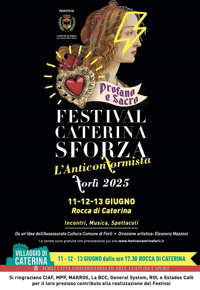 «Anche quest’anno, nella splendida cornice della Rocca di Ravaldino, torna la rassegna iconica di eventi, spettacoli, dibattiti e dialoghi con l’autore che ruota attorno alle gesta, all’anticonformismo, alla fierezza e al temperamento passionario della Leonessa di Romagna. La quinta edizione del Festival di Caterina affronterà con coraggio e dinamismo il binomio, volutamente ribaltato, del profano e del sacro, stimolando il punto critico proprio sul secondo aspetto. Sarà una tre giorni di riflessioni e grande valore artistico, ma anche un appuntamento di festa, dinamico e coinvolgente, con tanti punti ristoro, l’artigianato locale e le rievocazioni storiche del villaggio di Caterina».