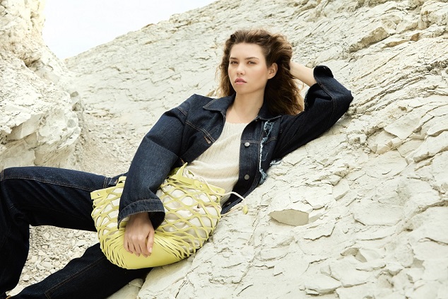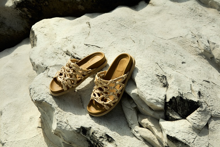 La capsule si compone di due elementi iconici che incarnano l’estetica del brand con sobria raffinatezza. La borsa a mano in pelle intrecciata è una creazione scultorea ma leggera. Accanto a lei, il sandalo flat in rafia intrecciata celebra la bellezza della semplicità.