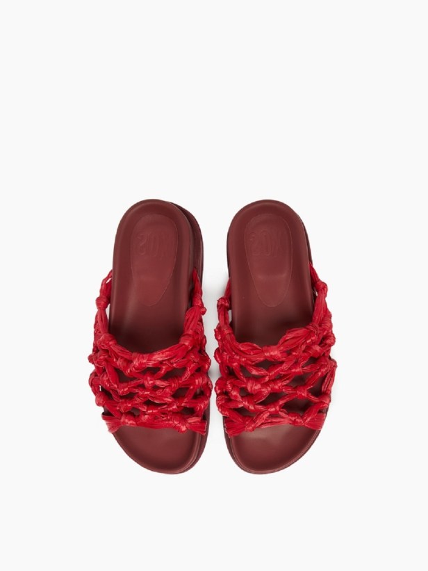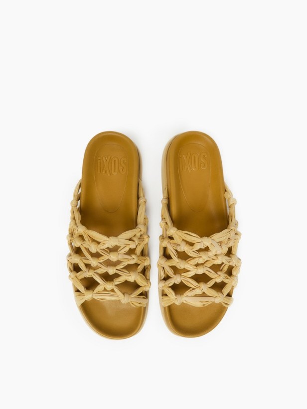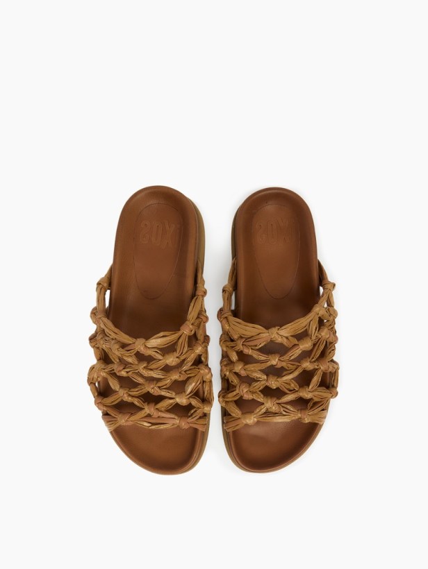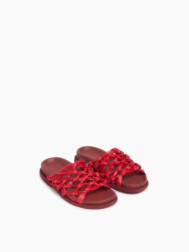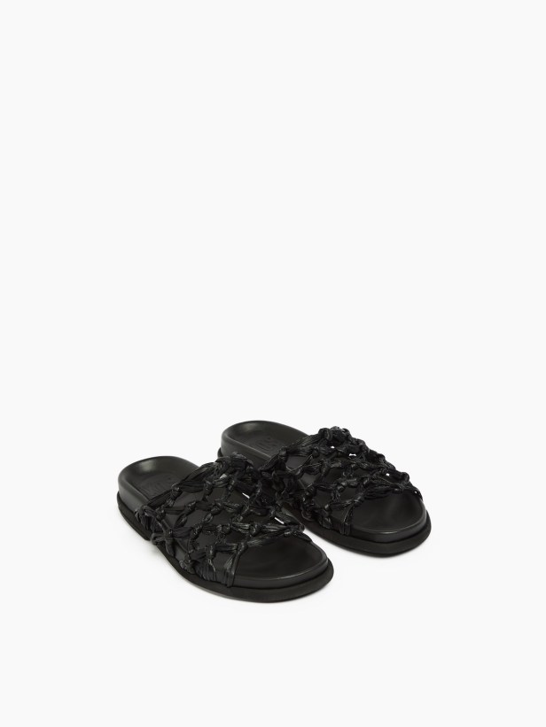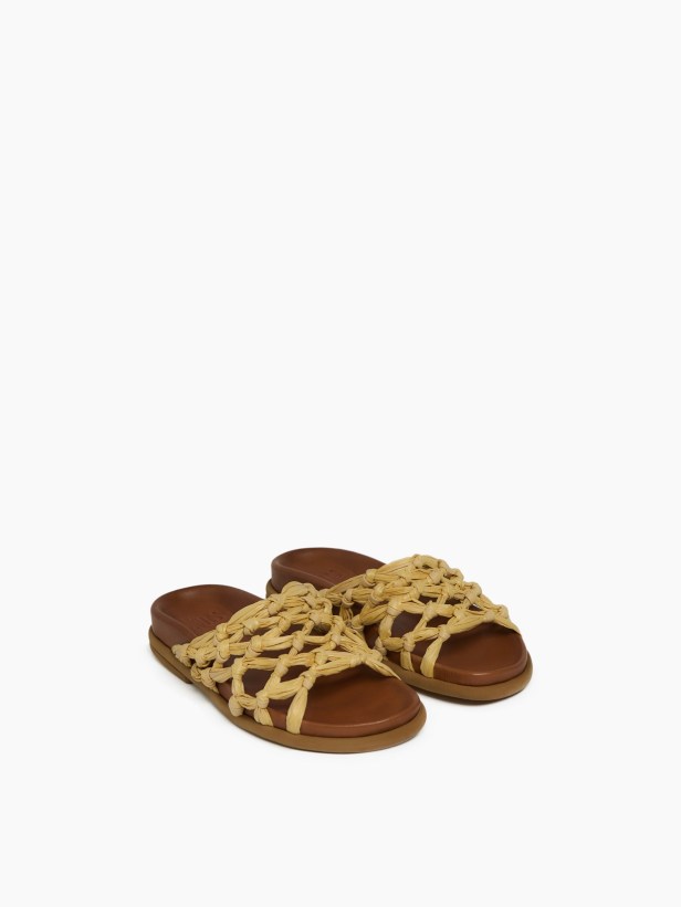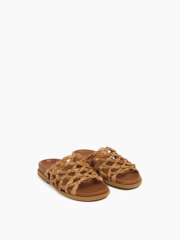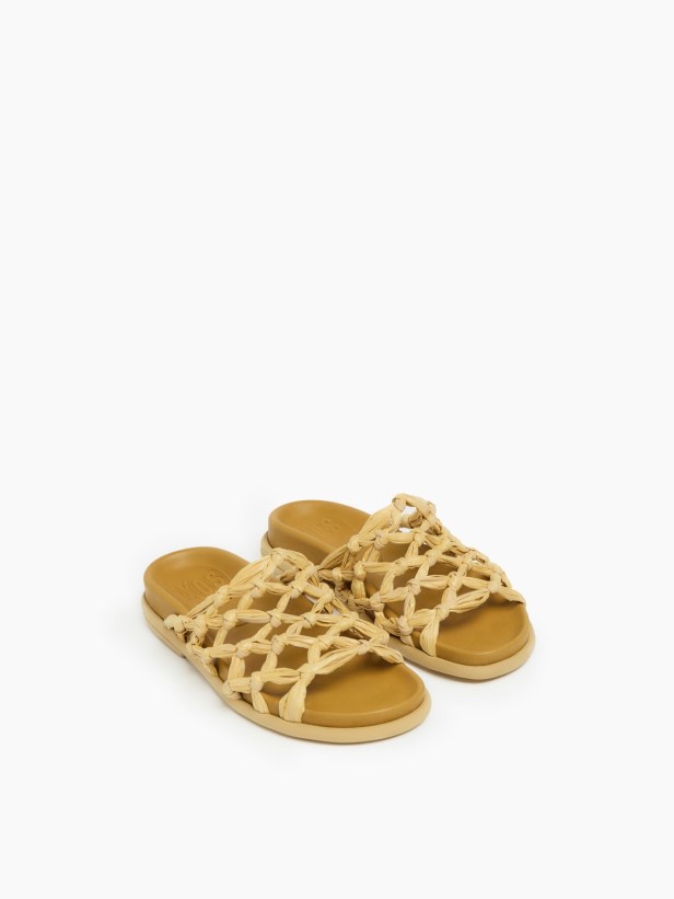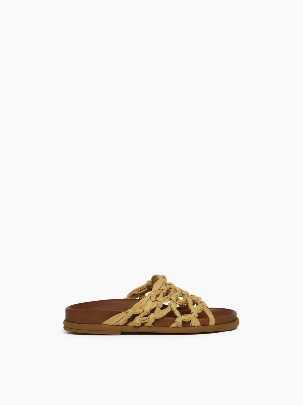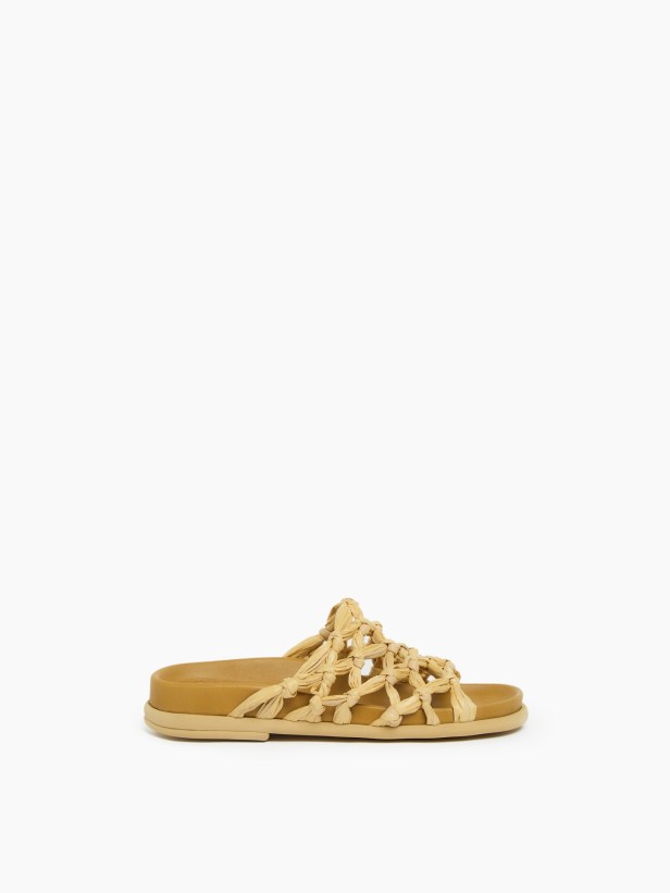 Accanto a lei, il sandalo flat in rafia intrecciata celebra la bellezza della semplicità. La tomaia, lavorata a mano in rafia 100% con effetto seta, accarezza il piede con delicatezza offrendo un comfort sofisticato.