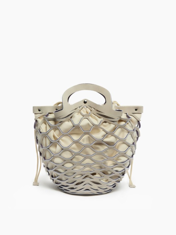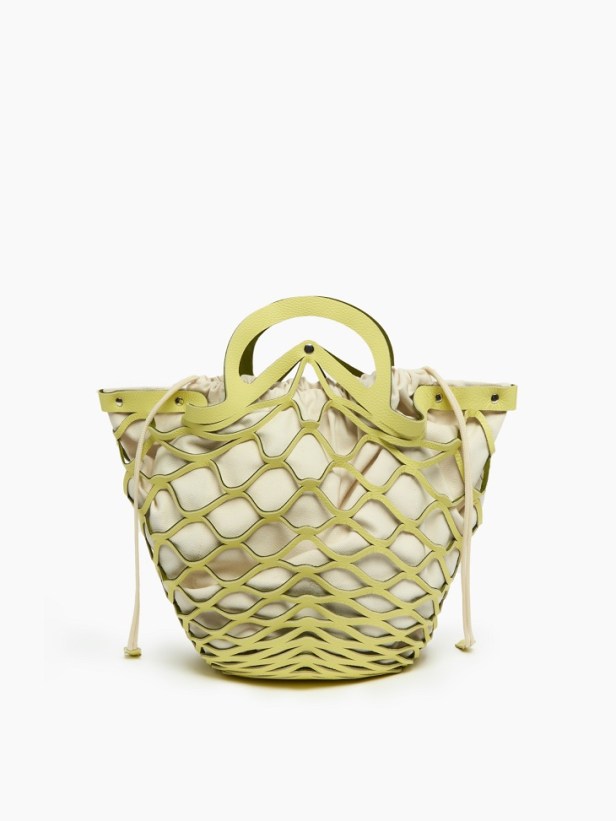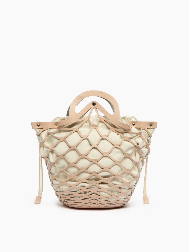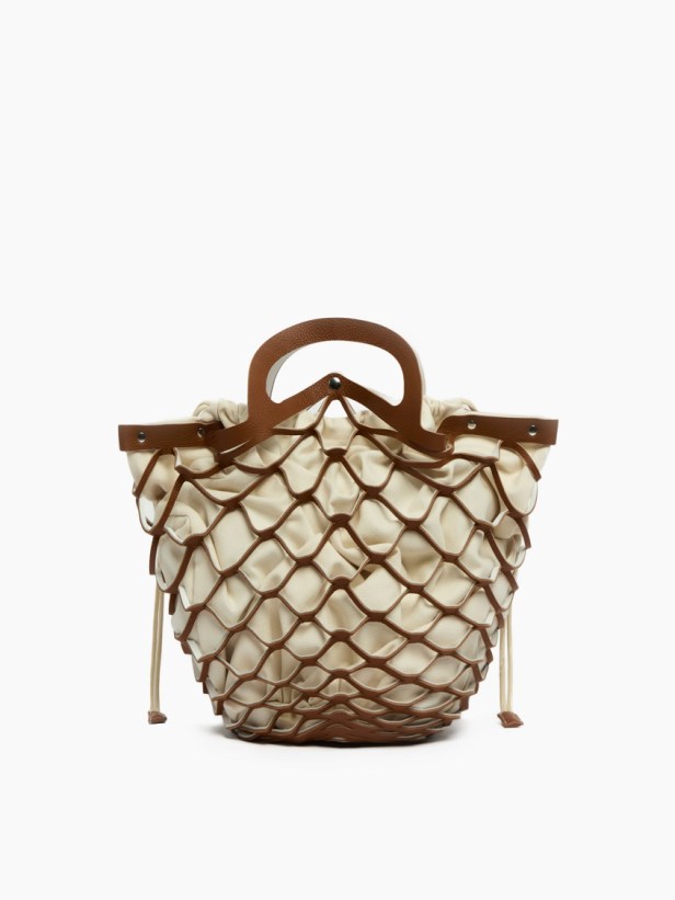La borsa a mano in pelle intrecciata è una creazione scultorea ma leggera, realizzata in doppia pelle 100% con una lavorazione a rete artigianale. Al suo interno, una sacca in cotone naturale con coulisse custodisce gli oggetti essenziali con discrezione. È un accessorio pensato per rendere iconici con naturalezza ogni look estivo.