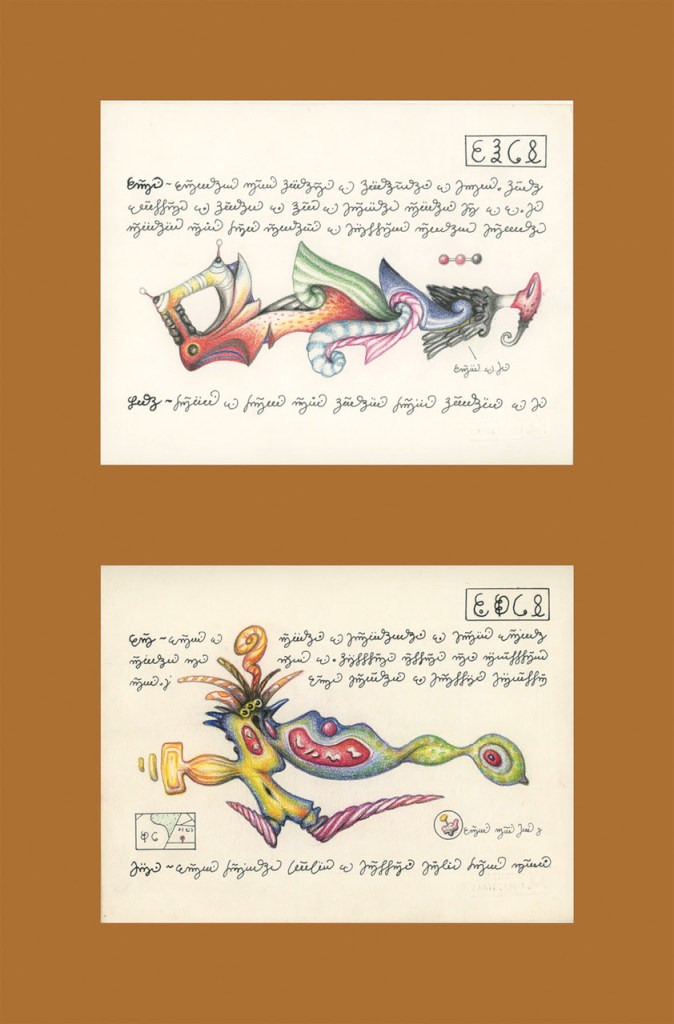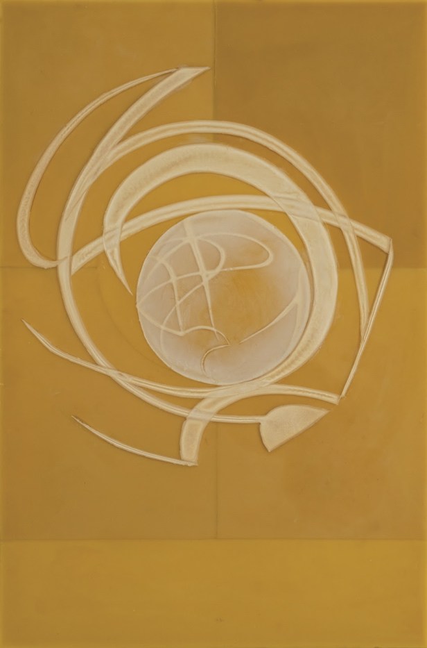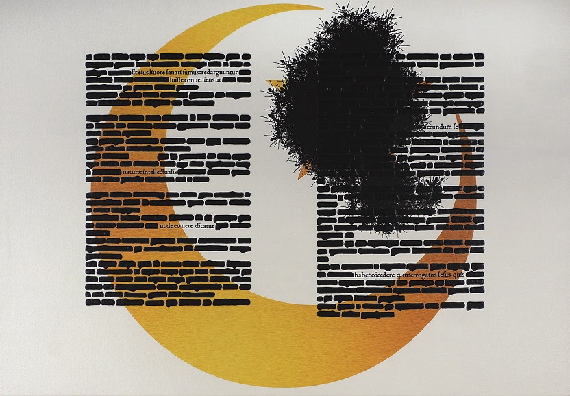 Ci sono però anche composizioni che utilizzando iconografie e forme riconoscibili creando stemmi misteriosi e per questo affascinanti, di cui noi abbiamo perduto l’origine o il significato ma di cui riconosciamo la potenza del valore dei Simboli: questi stemmi trovano un parallelo quasi diretto con le immagini di Ugo La Pietra, con le creazioni di Luigi Ontani, con i grandi fogli di Mimmo Paladino e con le opere di Joe Tilson, tutte riescono a riattivare i simboli antichi e parlare con voce nuova, come fossero segni del nostro tempo dando corpo all’idea di extra temporalità della storia dell’arte.