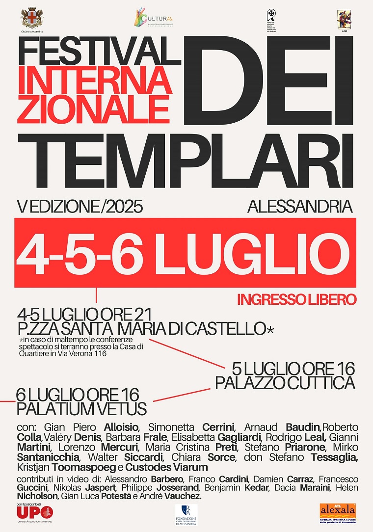 Venerdì 4, sabato 5 e domenica 6 luglio 2025 torna dopo il successo delle precedenti edizioni: due conferenze-spettacolo, una tavola rotonda, presentazione di libri… Tema di questa edizione: “Il mito dei Templari: da Napoleone a Umberto Eco, da Gerusalemme a Hollywood”. Il festival è diretto dalla storica e saggista Simonetta Cerrini e da Gian Piero Alloisio, drammaturgo e cantautore.