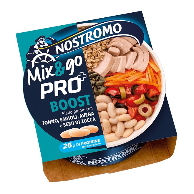 Un gusto intenso e sfizioso caratterizza anche Mix&Go Pro+ Boost, che combina sapientemente un binomio classico come tonno e fagioli, alla freschezza di pomodoro, carota, olive verdi e nere. Arricchita da avena e semi di zucca, questa insalata “apri e gusta” rappresenta un pasto completo e bilanciato.