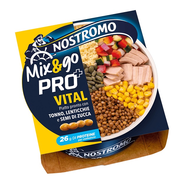 Mix&Go Pro+ Vital ricarica le energie grazie alle proteine del miglior Tonno Nostromo, abbinato a lenticchie, bulgur e un mix colorato e bilanciato di verdure, tra cui peperone rosso, mais, cipolla, carota, zucchina e pomodoro. Completano la ricetta semi di zucca e succo di limone, che dona una fresca nota mediterranea.