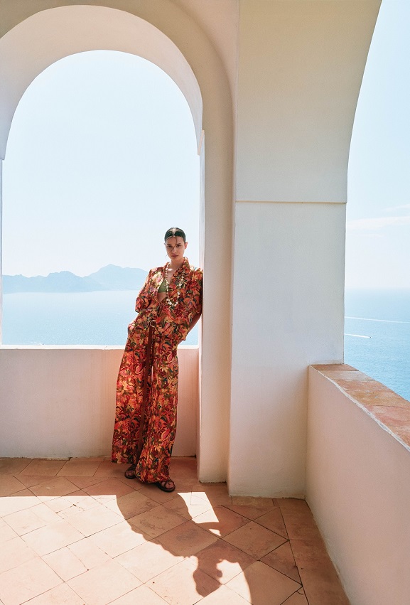 I tessuti naturali come la seta habutai e il voile di cotone diventano la base ideale per stampe vibranti che raccontano storie di giornate infinite e tramonti dorati.
