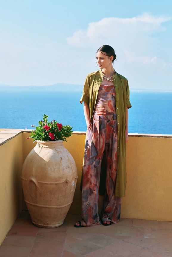 Le stampe, protagoniste indiscusse della capsule, giocano con motivi geometrici stilizzati e bouquet floreali, fiorendo su forme ampie e ariose. Ogni pattern è declinato su più basi tessili, conferendo dinamismo e profondità a una proposta dal carattere materico, sofisticato e naturalmente elegante.