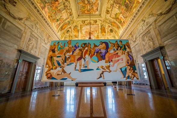 Le opere, che potranno essere acquistate, rappresentano non solo scorci della città e delle spiagge per lo più di Genova, ma anche l’arte e l’architettura specifiche di Villa delle Peschiere. Ispirandosi alle scene mitologiche dipinte sulla volta del Salone d’Onore da Giovanni Battista Castello detto il Bergamasco, Hawke traspone i personaggi del riquadro principale su una spiaggia ligure, mettendo in atto un divertente spostamento di significato e di riferimenti visivi, in omaggio alle molteplici narrazioni e suggestioni che intrecciandosi nel tempo hanno costruito la storia della villa.