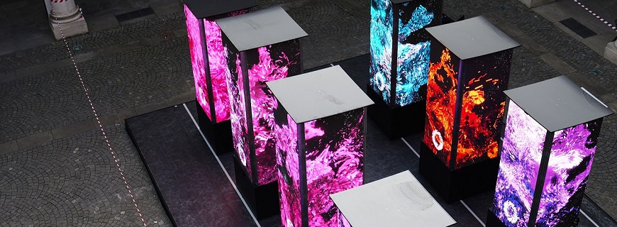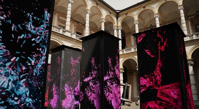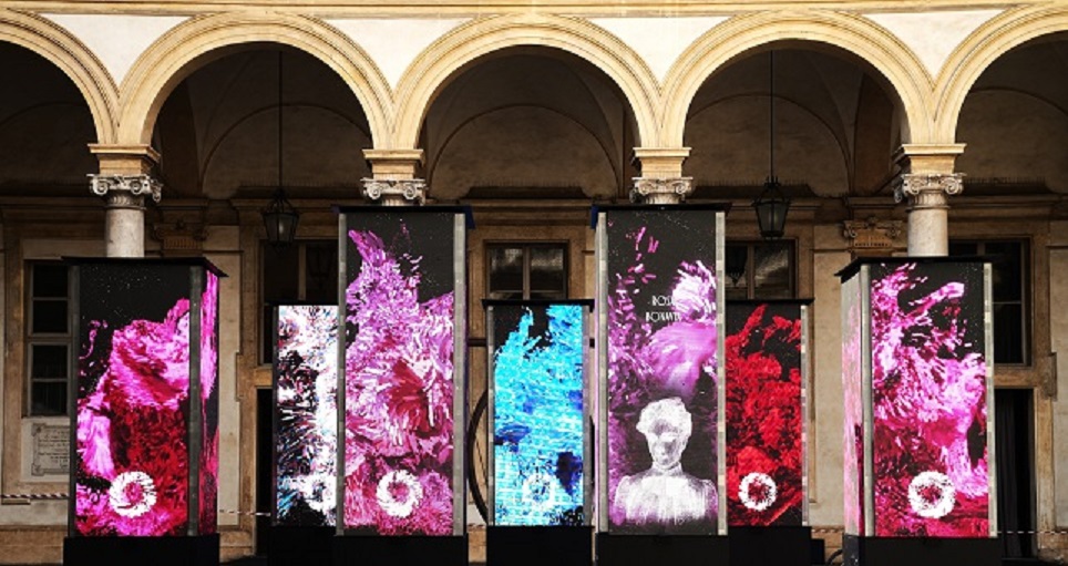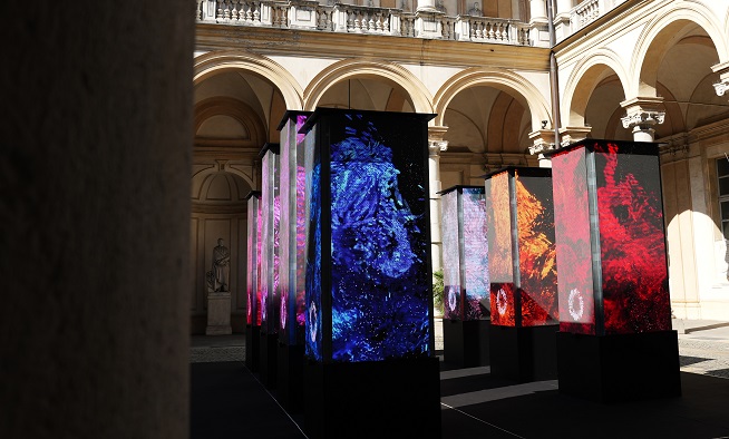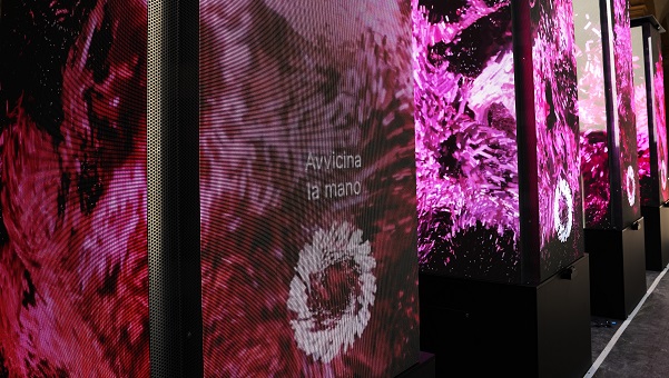 Superando la fissità del marmo, attraverso sette colonne digitali di ledwall, alte fino a quattro metri, il visitatore è invitato a esplorare un percorso non lineare, fatto di luci, suoni e contenuti multimediali attivabili al tocco. Solo così, in una dimensione di prossimità e ascolto, il ritratto potrà ricomporsi e prendere ancora una volta la parola.
