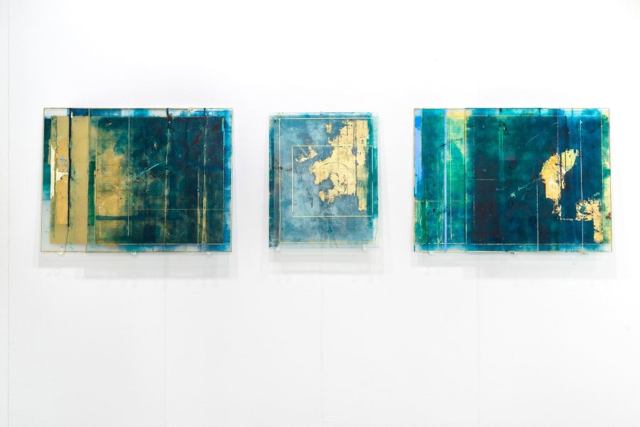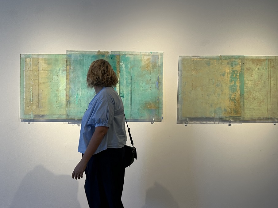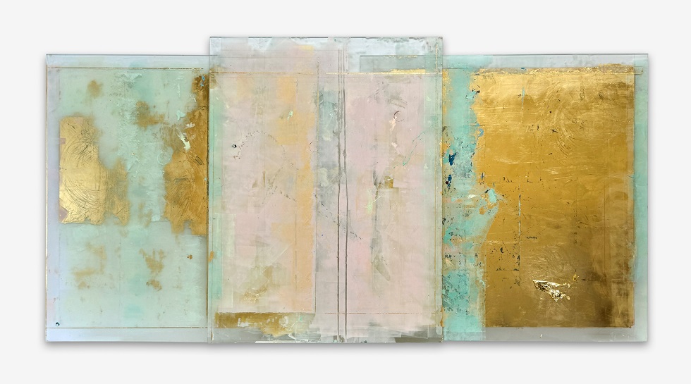 Accanto ai lavori su vetro, la mostra presenta opere su carta giapponese, nate anch’esse da una pratica lenta e meditativa. Antonello Viola lavora per sovrapposizione e sottrazione, costruendo per strati e poi riducendo all’essenziale. Ne scaturisce una pittura che non descrive, ma suggerisce; che non rappresenta, ma evoca. Le superfici diventano luoghi sospesi e silenziosi, capaci di trattenere e restituire luce, tempo e memoria. Una pratica non oggettiva e spirituale; più che di astrazione, si dovrebbe parlare di “non oggettività”, chiamando in causa Malevič e la sua “trasfigurazione nello zero della forma”. Pigmenti, foglia d’oro, trasparenze e cancellature si intrecciano come tracce in trasformazione, generando immagini interiori, mutevoli, aperte all’interpretazione.