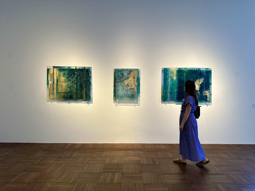 Nel confronto con la città di Venezia, Viola accoglie e continua il vibrante rapporto tra luce, cielo e acqua che caratterizza questa città. L’andirivieni di fluidi scandisce inevitabilmente il tempo e la vita. Proprio questo fluire è ciò che l’artista ha cercato nelle sue opere per Ca’ Pesaro: in ogni vetro la pittura assume una dimensione tridimensionale, grazie a lastre disposte su più livelli e dipinte su entrambi i lati. Una superficie fragile e trasparente su cui il tempo si deposita in forma di velature, cancellature e stratificazioni, riflettendo i mutamenti della luce sull’acqua e suggerendo paesaggi mobili, dai confini incerti.