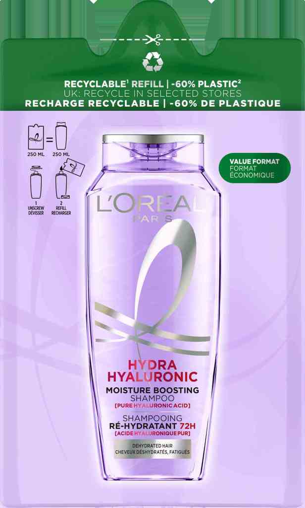 Le eco-refill Elvive permettono di risparmiare fino al 60% di plastica rispetto a un flacone di shampoo standard (rispetto a un flacone di shampoo da 250 ml).