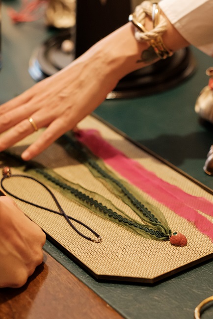Elemento distintivo di questa collaborazione è il tocco sartoriale di Le Tre Sarte, che firma con cura e sensibilità i cordini in pura seta, proposti in varianti colori diversi, intrecciati o nella versione più classica in seta sfrangiata, interpretati quindi come dettagli preziosi, unici e delicati, che arricchiscono ulteriormente la preziosità dei gioielli Villa Milano.
