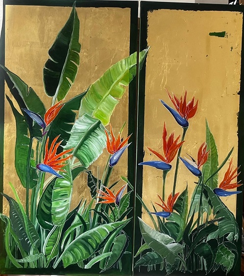 Ed infine i fondi oro di Elena Conti, artista, curatrice e organizzatrice di mostre internazionali, che espone le sue opere, fiori di agapanto, sterlizie, aranci e le lascia fluttuare in uno spazio sospeso e senza tempo. Colpi di spatola d’oro, simbolo di eternità, avvolgono i fiori, suggerendo un equilibrio tra materia e spirito. L’opera invita a esplorare una dimensione metafisica, dove la serenità diventa un’esperienza mistica e il mondo onirico si manifesta in forme pure e incontaminate.