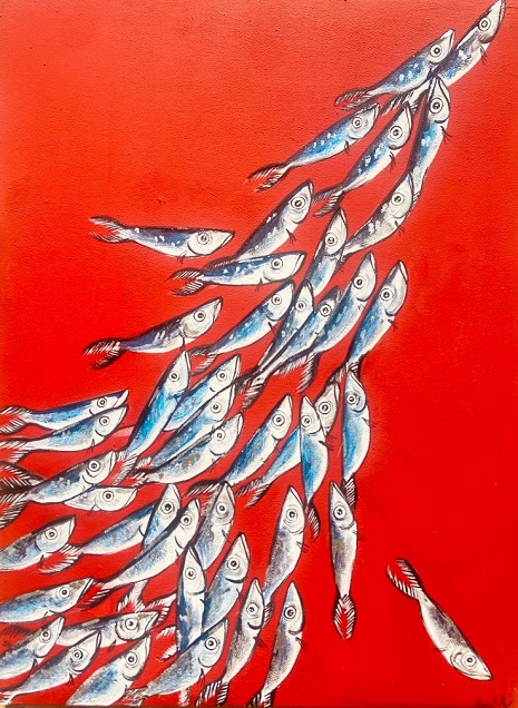 Le opere costellate da pesci guizzanti hanno costituito il tema dell’artista Ilaria Di Meo, dove possiamo notare il percorso artistico dell’artista che coglie la forma compiuta, colorata e colta nell'attimo del guizzo che esprime tutta la forza e la vitalità del pesce nel suo ambiente naturale, i compatti banchi di pesci, il singolo individuo che spicca per il suo colore più vivo, quasi un tentativo di fuggire dalla massa anonima per l'affermazione della propria unicità a scapito del sicuro abbraccio protettivo dell'anonimato.Ilaria Di Meo, originaria di Napoli ha vissuto molti anni a Genova e il mare è il suo elemento, esprime un’arte che ha il sapore della libertà, della leggerezza, del movimento e del gioco, con protagonisti soggetti a lei cari e ricorrenti nelle sue opere.