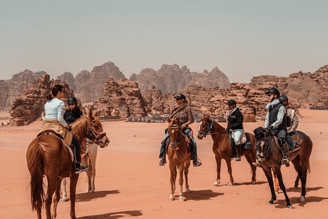 Il viaggio inizia con la visita a Medâ’in Saleh e ai resti della città nabatea di Hegra, per poi dedicarsi a 4 giorni e mezzo di trekking a cavallo lungo le bellissime piste del deserto di arenaria dal caratteristico color ocra, tra valli, canyon e montagne di forme diverse (tra cui la famosa Elephant Rock), dove ammirare anche antiche incisioni rupestri con figure umane e di animali.