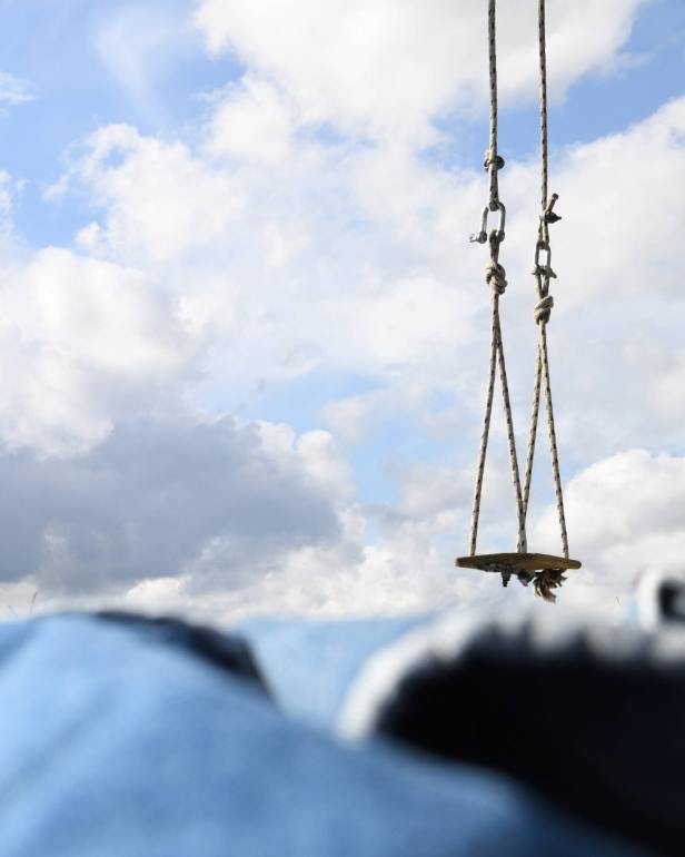 A guidare il visitatore per tutto l’attraversamento, una serie di piccole opere disseminate negli spazi della casa e firmate da Massimo Uberti agiscono come tracce silenziose, presenze quasi impercettibili che accompagnano e preparano la risalita finale. Il cammino culmina infatti all’esterno, dove Uberti lascia sospesa, sulla sommità del colle di Mezzanotte, la sua installazione più prossima al cielo: un’altalena rivestita in foglia d’oro, posta come soglia concreta e simbolica tra la terra e l’infinito.