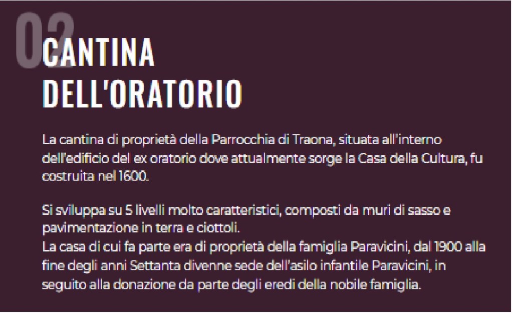 Casa Sforzini, situata nel centro del borgo di Traona, possiede il forno che veniva usato dalle famiglie del paese per cuocere i prodotti da consumarsi quotidianamente e durante le feste. Il grano veniva lavorato, raccolto e macinato al mulino per ottenere la farina che serviva per preparare il pane che, da sempre elemento principale dell’alimentazione popolare, veniva preparato e cotto in casa. Le donne si recavano in casa Sforzini per organizzare i turni per L’utilizzo del forno e dopo aver preparato l’impasto nelle proprie case raggiungevano l’abitazione, portando nella gerla la legna da ardere. Nel periodo Natalizio il forno rimaneva in funzione per 15 giorni di fila durante i quali, oltre al pane, venivano cotte bisciole e focacce. I cittadini che utilizzavano il forno erano soliti lasciare una parte del preparato alla famiglia Sforzini come ringraziamento. Oggi, di proprietà del Sig. Vittorio Sforzini, è utilizzato a livello famigliare e aperto al pubblico durante eventi enogastronomici.