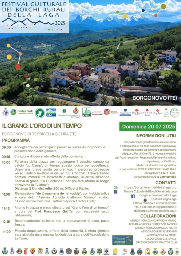 Nella giornata seguente di domenica 20, la rassegna diffusa arriverà a Borgonovo di Torricella Sicura (TE) con l’evento “Il grano: l’oro di un tempo” dove, grazie al rapporto di collaborazione avviato con le Sezioni Regionali Slow Food di Abruzzo, Lazio e Marche, una ventina di tenaci cittadini “restanti” si sono attivati da settimane per rievocare i metodi, le ritualità e i simboli legati alla coltivazione del Grano, una delle prime piante in assoluto domesticate dall’uomo.
