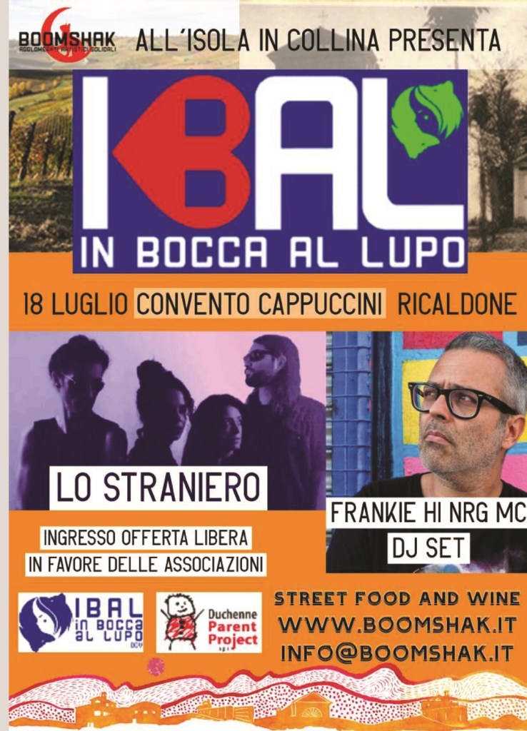 | Venerdì 18 luglio | Cantina Cappuccini 21.00: Apertura: Lo Straniero 21.30: Frankie Hi-Nrg in Dj set Street food e vini della casa ingresso a offerta devoluto a favore di “In Bocca al Lupo o.d.v.” e Parent Project |