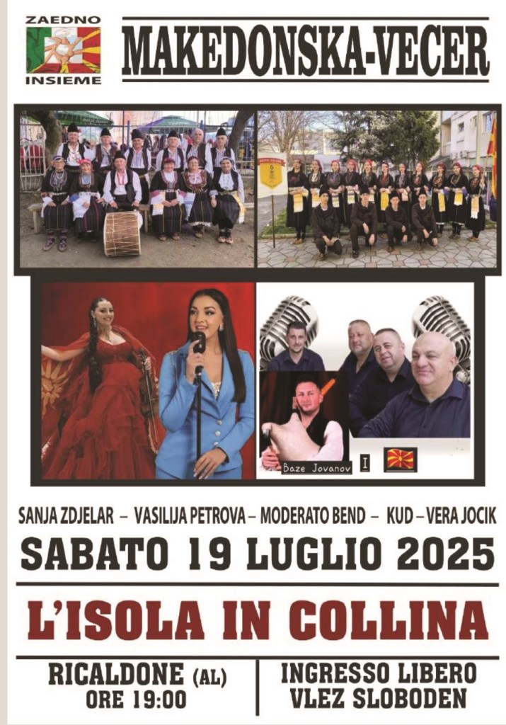 La seconda serata del 19 luglio nasce in collaborazione con la numerosa comunità macedone di Ricaldone con l’ambizione di ripetere l’enorme successo delle ultime edizioni, che hanno avuto più di mille partecipanti. Si esibiranno, in un concerto ad ingresso gratuito, due cantanti macedoni (Vasilija Petrova e Sanja Zdjelar) accompagnate dalla Moderato Bend e con i ballerini della scuola di danze popolari Kud e Vera Jocik. Durante la serata i vini di Ricaldone saranno abbinati ai piatti della tradizione macedone.